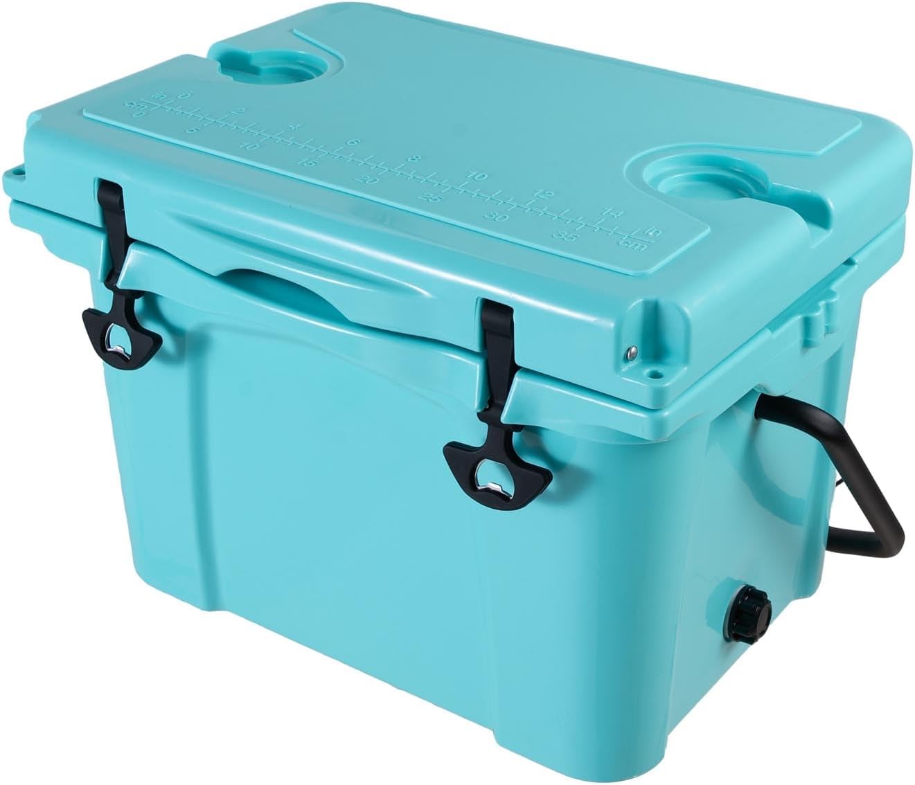 Q: What is the capacity of this cooler?A: It perfectly holds up to 30 cans of your favorite beveragesQ: How long can it keep ice frozen?A: It provides outstanding cold retention for up to 5 days under optimal conditionsQ: What are the optimal conditions for 5-day ice retention?A: It requires a 2 to 1 ice-to-contents ratio and depends on ambient high temperaturesQ: What material is used for the shell?A: It is crafted using extremely durable crushproof rotomolded plastic technologyQ: How thick is the insulation?A: It utilizes a commercial-grade 3-inch polyurethane foam insulation layerQ: Why does the empty cooler weigh 18.7 pounds?A: The weight reflects its genuine heavy-duty construction built for harsh outdoor environmentsQ: What color is this small ice chest?A: It comes in a vibrant turquoise color that stands out perfectly at the beachQ: How does the lid stay securely closed?A: It is equipped with heavy-duty rubber T-latches to ensure a tight sealQ: Does it have a good sealing gasket?A: Yes it uses a freezer-grade gasket to effectively block out external heatQ: What are the exact exterior dimensions?A: The exterior measures 21.46 inches long by 15.75 inches wide and 15.55 inches highQ: Does it come with a bottle opener?A: Yes the lid features a built-in stainless steel bottle opener for your convenienceQ: Are there cup holders on top?A: The lid includes dual molded cup holders to prevent your drinks from spillingQ: Is there a measuring tool for fishing?A: Yes it features a convenient forming ruler right on the top lidQ: How do I drain the melted ice water?A: It includes a quick V-shaped drainage system for fast and easy water removalQ: Is it easy to carry around?A: It features an ergonomic soft-grip handle designed for comfortable transportQ: Will it slide around in the back of my truck?A: No the non-slip rubber feet at the bottom keep it securely in place on bumpy roadsQ: What are the ideal uses for this travel cooler?A: It is an excellent choice for camping fishing beach trips and tailgatingQ: Can I use it as an extra seat at the campsite?A: Yes the robust rotomolded construction is strong enough to support an adult sittingQ: Are any tools required to clean it?A: No additional tools are required to drain the water and wipe down the interiorQ: Should I pre-chill the cooler before use?A: Yes pre-chilling with sacrifice ice beforehand maximizes the overall cold retentionQ: Can this insulated cooler keep food warm too?A: Yes the thick commercial insulation can also retain heat for warm food itemsQ: Is it compact enough to fit in a car trunk?A: Yes its compact design fits easily in most vehicle trunks for long-distance travel