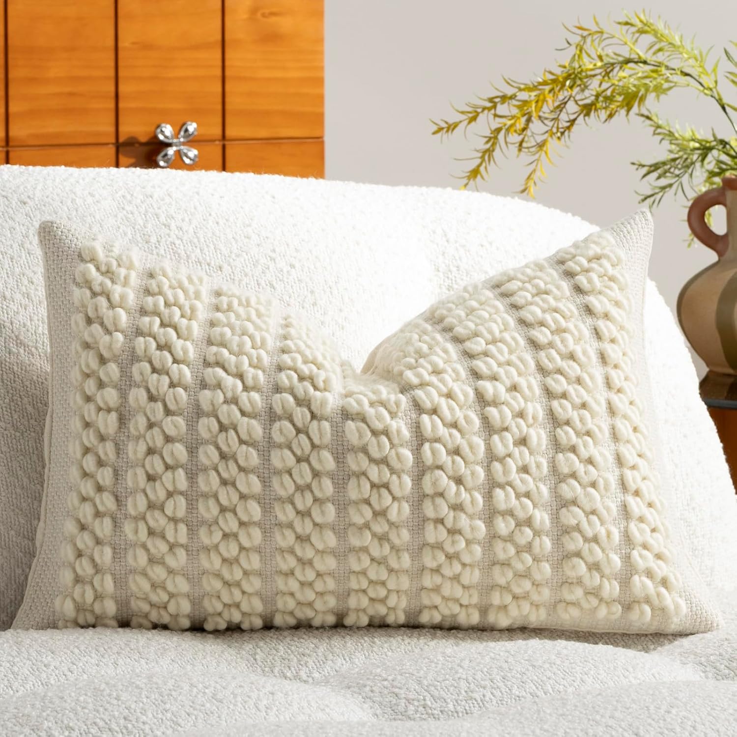 Upgraded Chic Wool Texture Stripe Accent Pillow CoverChic and Durable, these wool throw pillow covers feature a unique textured design. Ideal decoration for a boho or farmhouse living room, they provide a cozy, stylish accent for any couch.