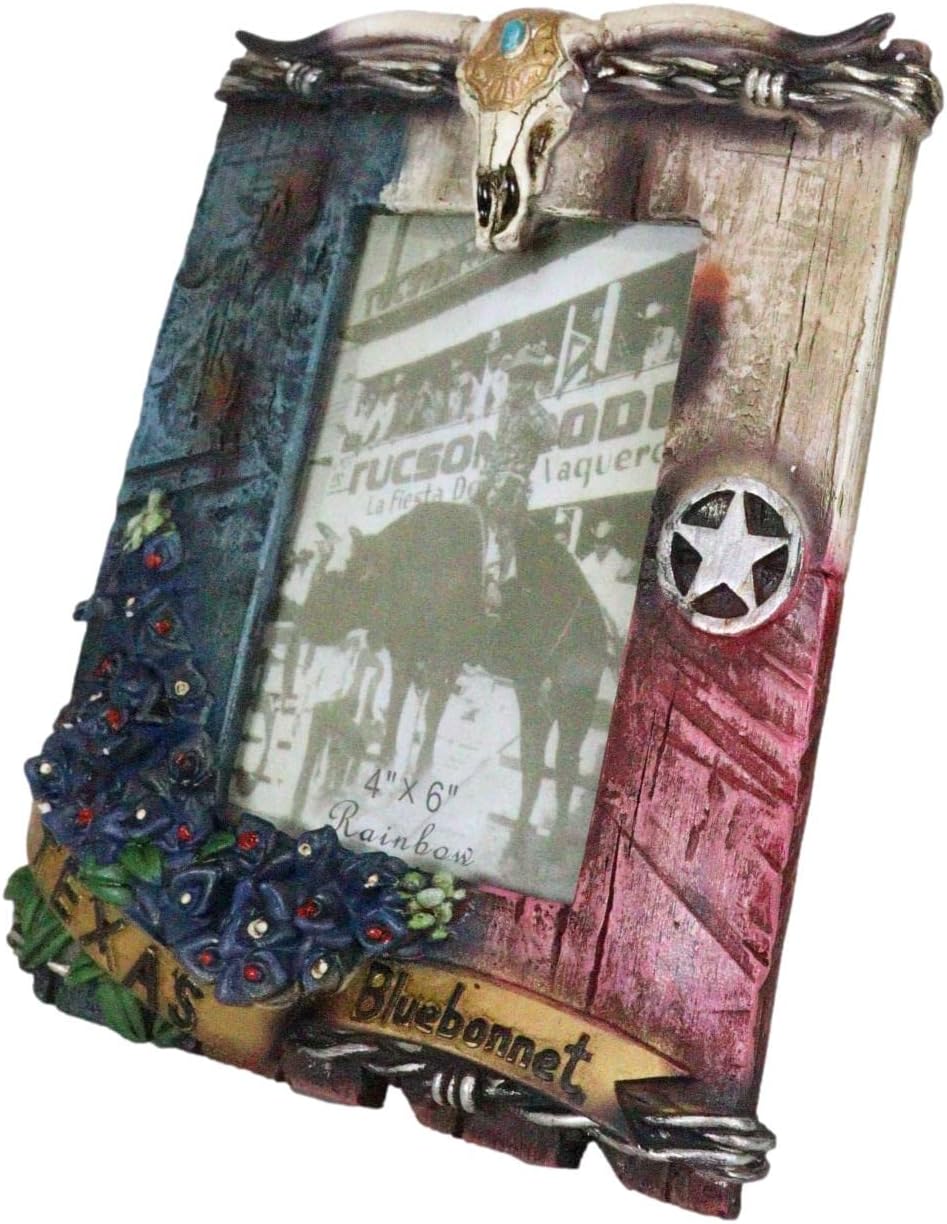Do you know a Patriotic Country Western or Cowboy Texas Theme Lover out there that needs a Wild Wild West framed wall decor? This is the perfect Western Decoration piece and a great gift for birthdays, Christmas, Veterans Day, or just because. A great conversation piece and an awesome addition to any room. Starting with a texas state flag designed photo frame, we add western elements like the lone star circle, bluebonnets and aa ribbon that reads Texas and a longhorn cow skull.
