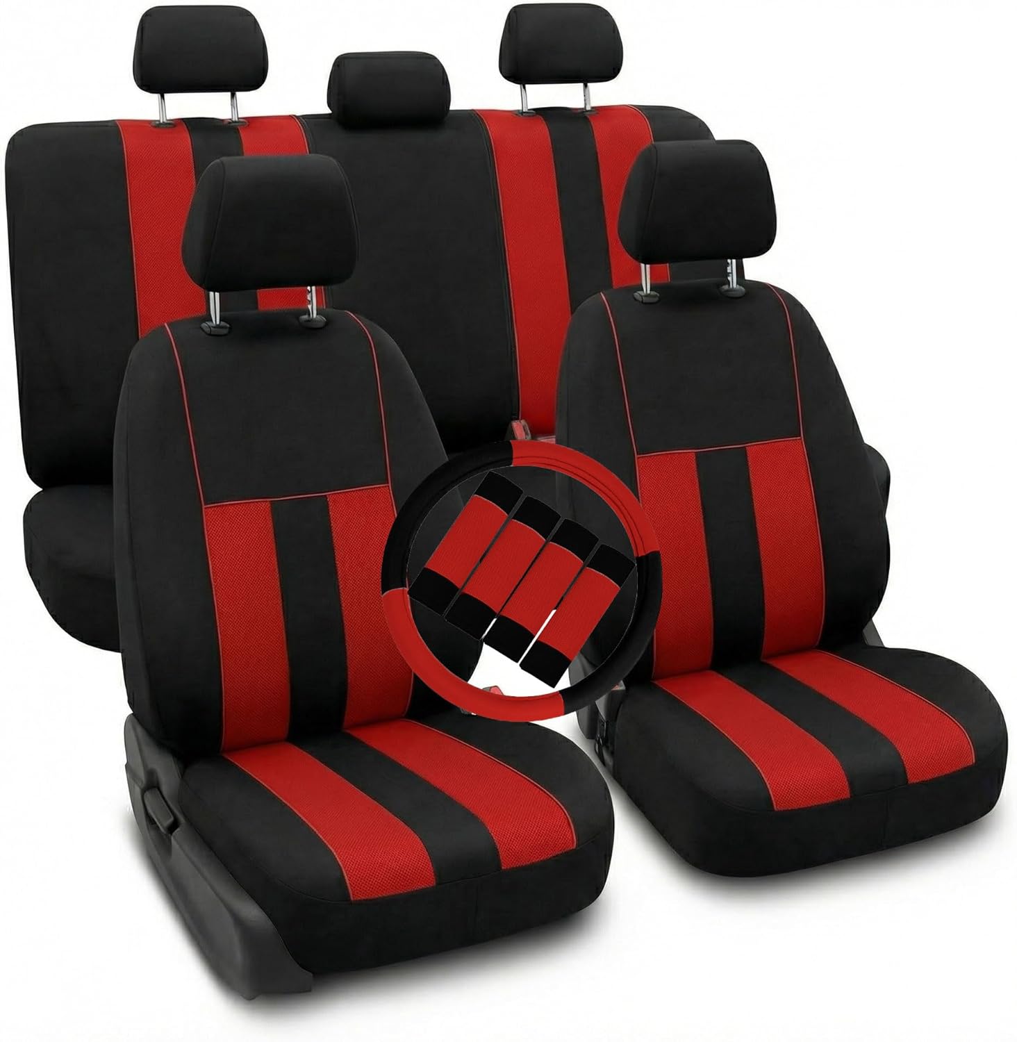 | Included Components | 2 front bucket seat covers, 1 rear backrest cover, 1 rear bottom bench cover, 5 separate headrest covers, & 1 steering wheel cover, & 4 seat belt pads |