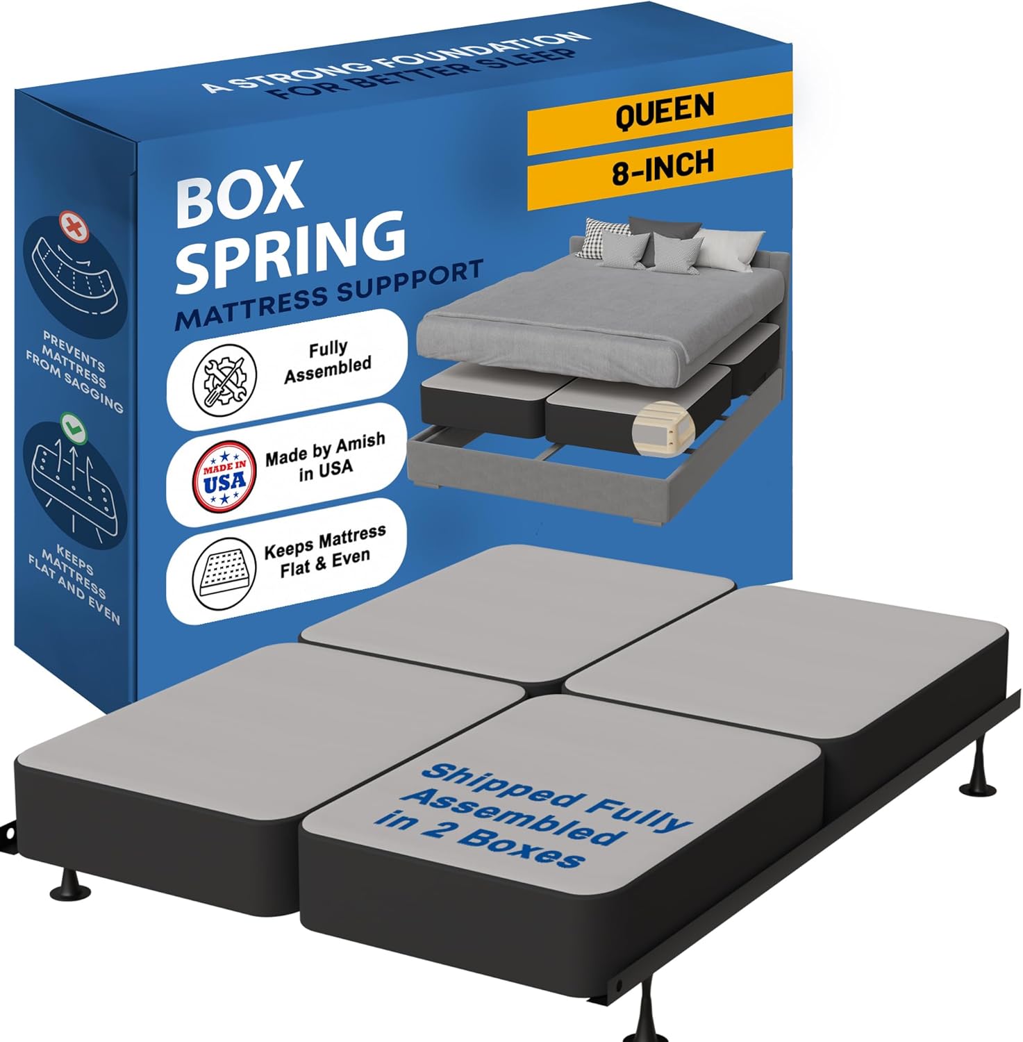 The right kind of smart box spring bed base can change everything & provide mattress comfort and stability. It’s the difference between deep sleep and restless nights. Between a mattress setup that fits easily through stairwells, and one that gets jammed halfway up the landing. Between moving in stress-free… and not at all.That’s why this fully assembled wood box spring was built for real life. Solid wood pieces, durable joints, and Amish craftsmanship come together to give your mattress the support it needs – without the headaches you don’t.Instead of stiff metal or squeaky materials, you get natural wood with just the right amount of give. It stays quiet through the night and comfortable under pressure, helping your mattress feel more supported.PRODUCT SPECIFICATIONS:Sizes: Twin, Twin XL, Full, Full XL, Queen, King, Queen(Fold), King(Fold), California King(Fold)Heights: 2", 4" or 8"Colours: White or GrayMaterial: Solid WoodAssembly: Fully AssembledOrigin: Amish-Made in the USAIncludes: Box Spring OnlySPLIT DESIGN FOR EASY TRANSPORTForget the frustration of cramming bulky box springs through doorframes. This comes in split pieces – able to fit through tight stairwells and be easily set up once in the room. Great for any setup, especially if space is limited.SOLID SILENT SUPPORTThe wood frame flexes just enough to be comfortable without creaking or shifting over time. It works with all mattress types like memory foam, latex, spring and hybrid—and gives you a stable, quiet base that stays supportive through the night. Strong support for your mattressMADE IN AMERICA BY THE AMISHThis box spring foundation is made in the USA by experienced Amish craftsmen who take pride in doing things right. From the quality of the wood to the precision of the joints – it’s built with care and built to last.One of the key benefits of this box spring is its ability to absorb pressure, which helps distribute weight evenly across the bed, reducing the amount of pressure on your back, neck, and other joints. Additionally, this box spring is available in a range of sizes and thickness options, including twin, twin XL, full, full XL, queen, king, queen(Fold), King(Fold)and California king(Fold), so you can choose the level of support that best suits your needs and also available in low profile bed base and high profile bed base.Plus, with its sleek and simple design, this box spring will complement any bedroom decor. It is available in two stylish colours, white and Gray, so you can choose the one that best fits your style. Durable frame with horizontal slats for strong mattress supportIn summary, our natural wood box spring is the perfect accessory for anyone who wants a durable, supportive, and fully assembled box spring for their mattress. With its ability to distribute weight evenly, it reduces pressure on your body and ensures a comfortable sleep. Choose from a range of sizes and thickness options and upgrade your bedroom with this must-have accessory today!