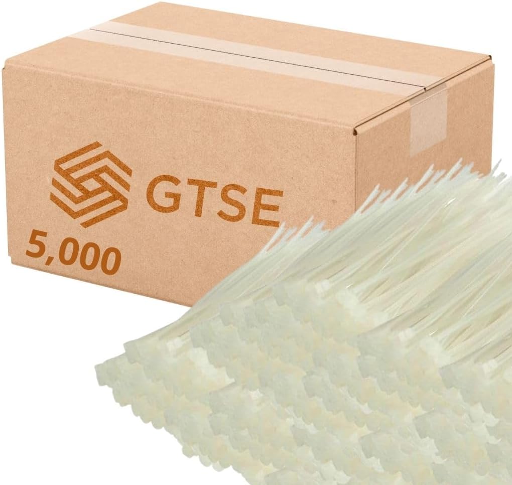 What's in the package?You'll receive 5,000 durable, white/Clear nylon zip ties, which can be used indoors and outdoors.Item specificsDimensions (length x width): 8" x 0.19"Material: Durable and UV-resistant nylon polyamide 6/6Colour: White/ClearActive working temperature: -40°F to +185°FFlammability rating: UL 94 class V2Dielectric strength: 50,000 volts/mm More about this productOur 8" x 0.19" (50 Ib Strength) zip ties can be used for all sorts of practical projects, whether it's a quick and simple fix in the home or garden, or an extensive and time-sensitive commercial project that demands an effective solution, fast!Measuring up at 8" (200mm) in length and 0.19" across, you've got plenty of room to play with if you're bundling cables or wires, while their greater-than-average width keeps things even more secure.