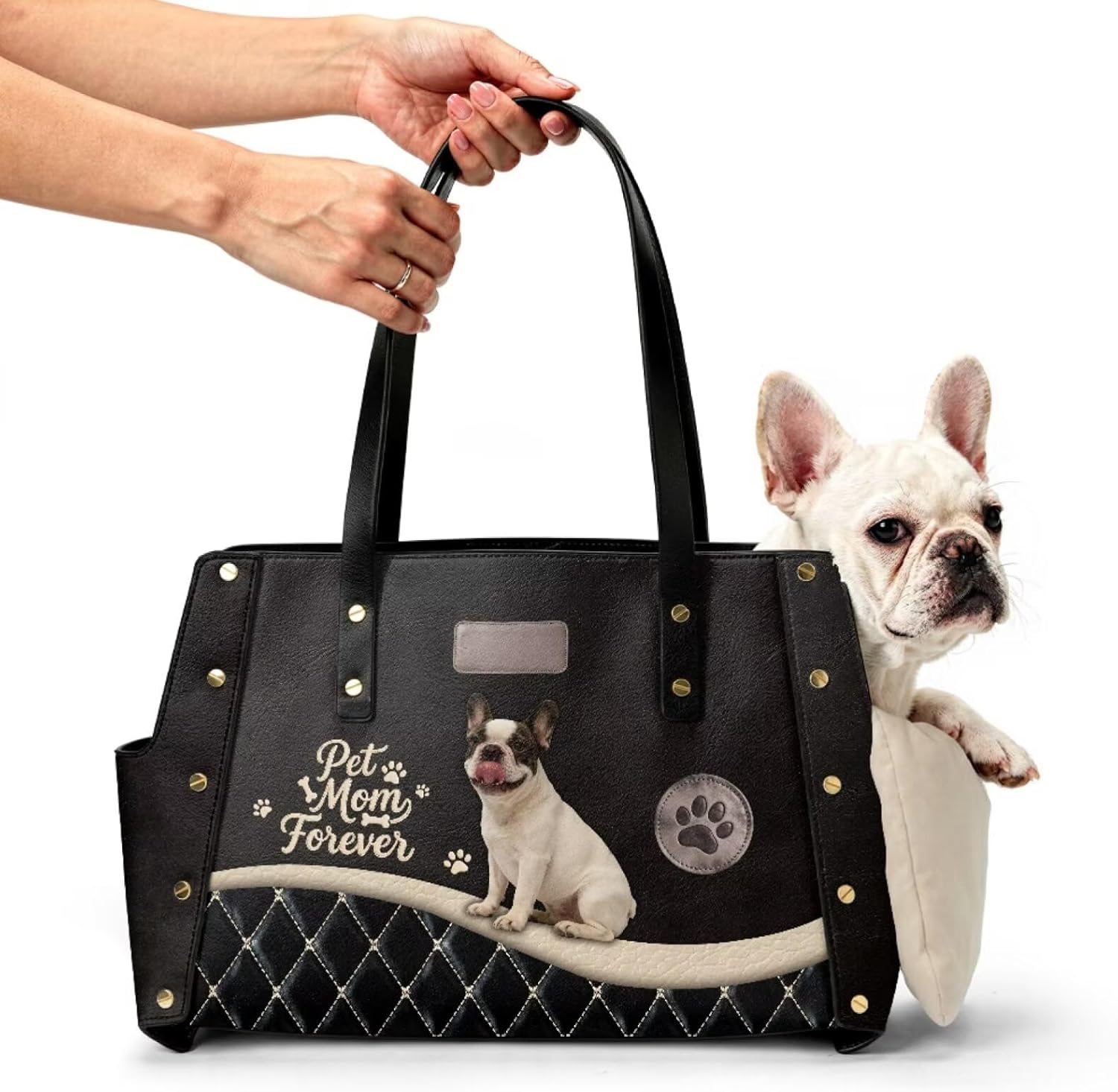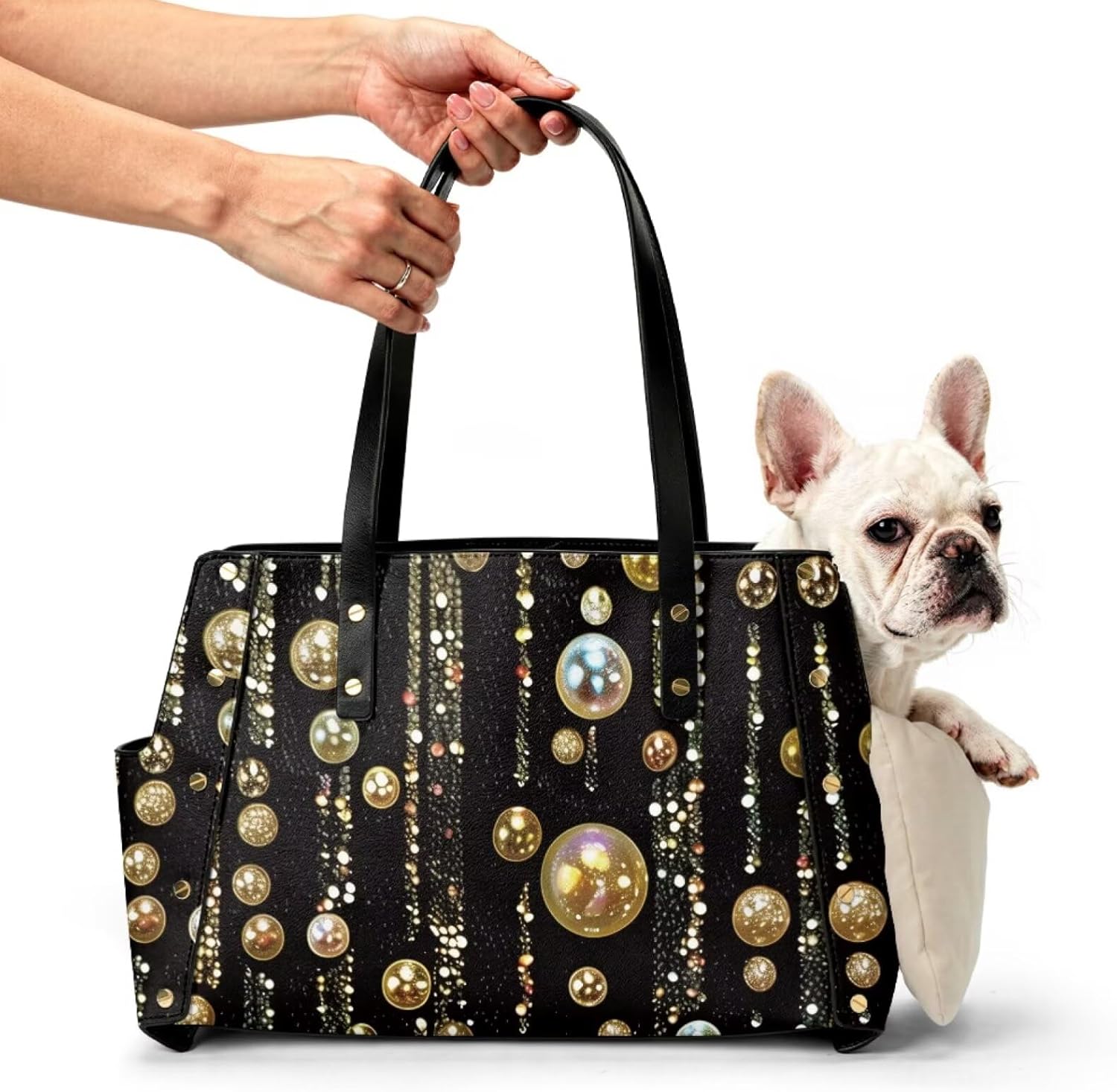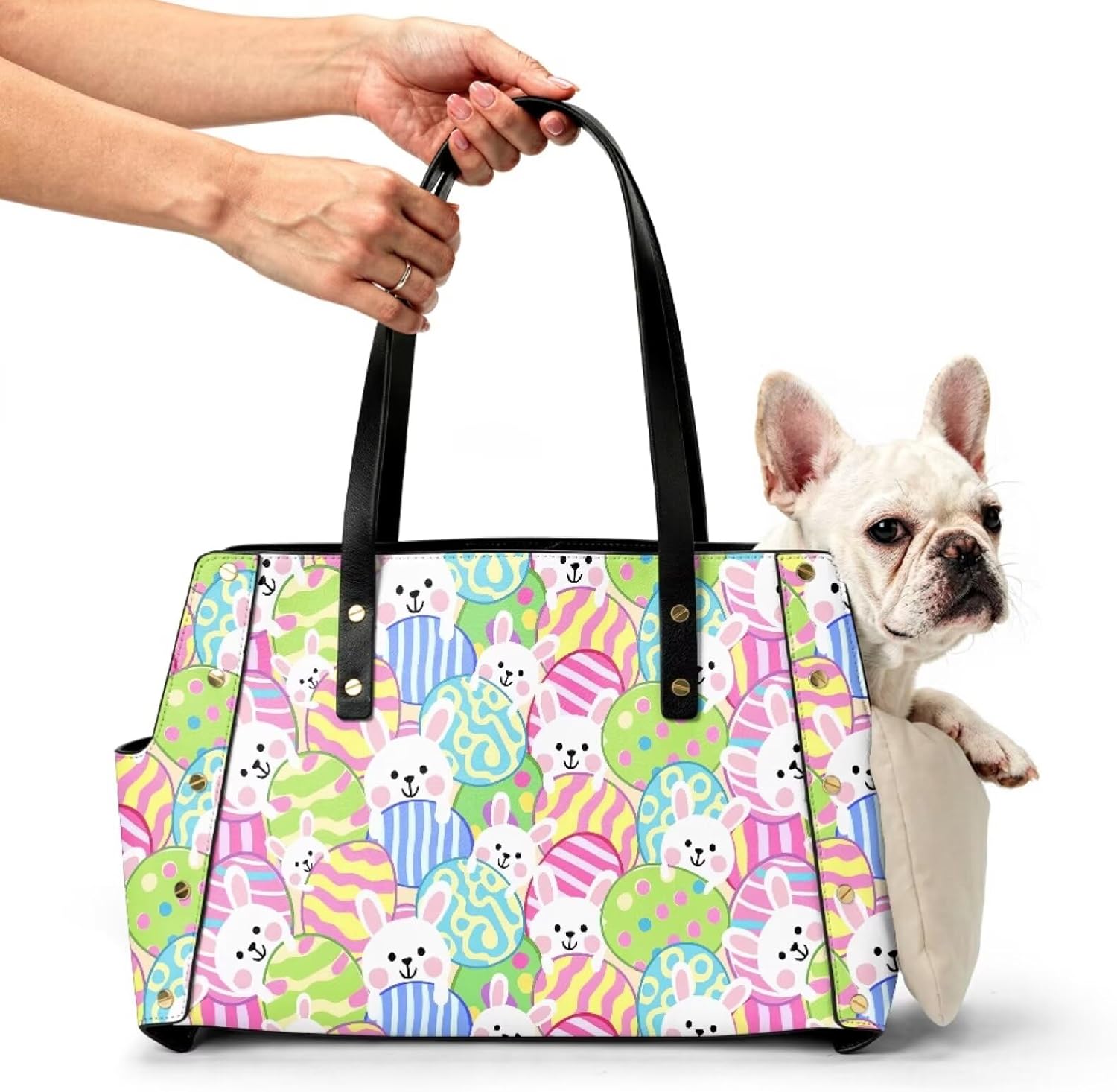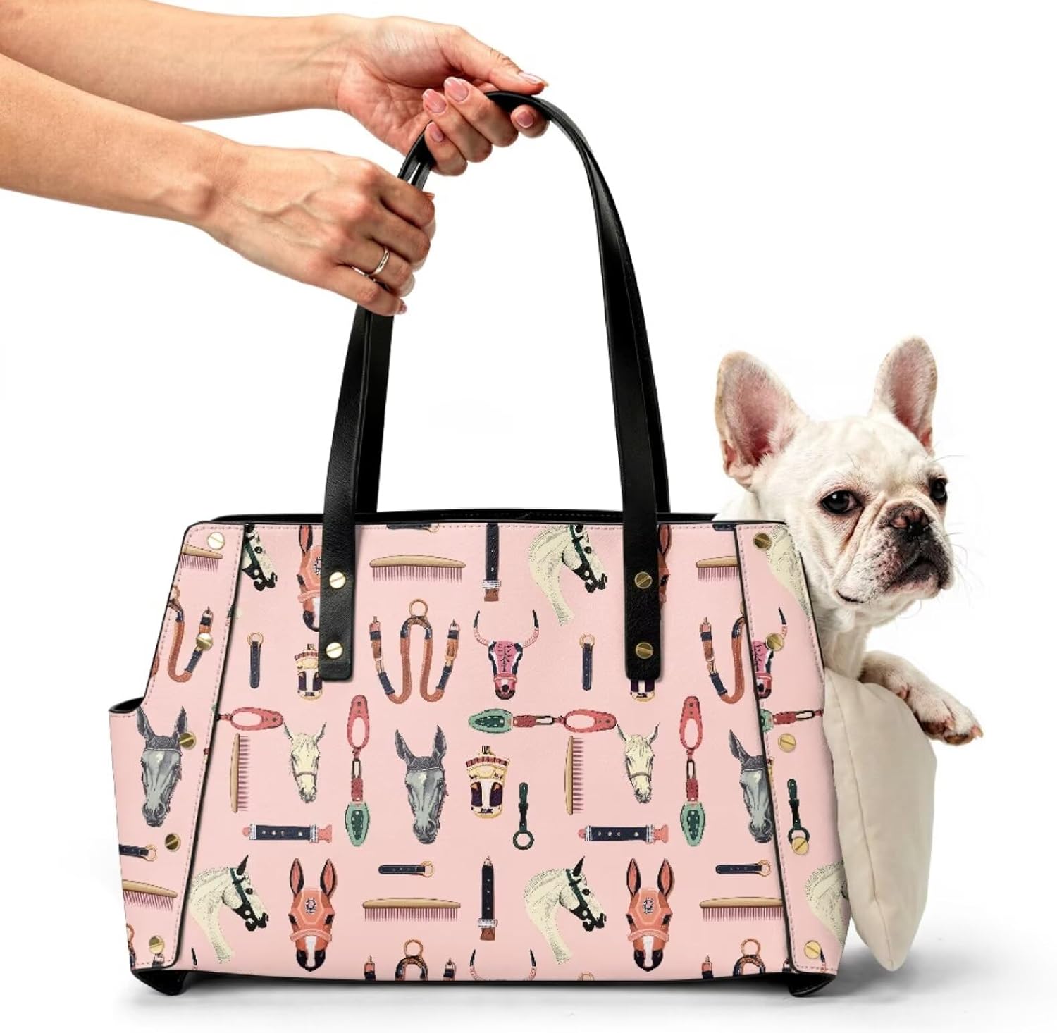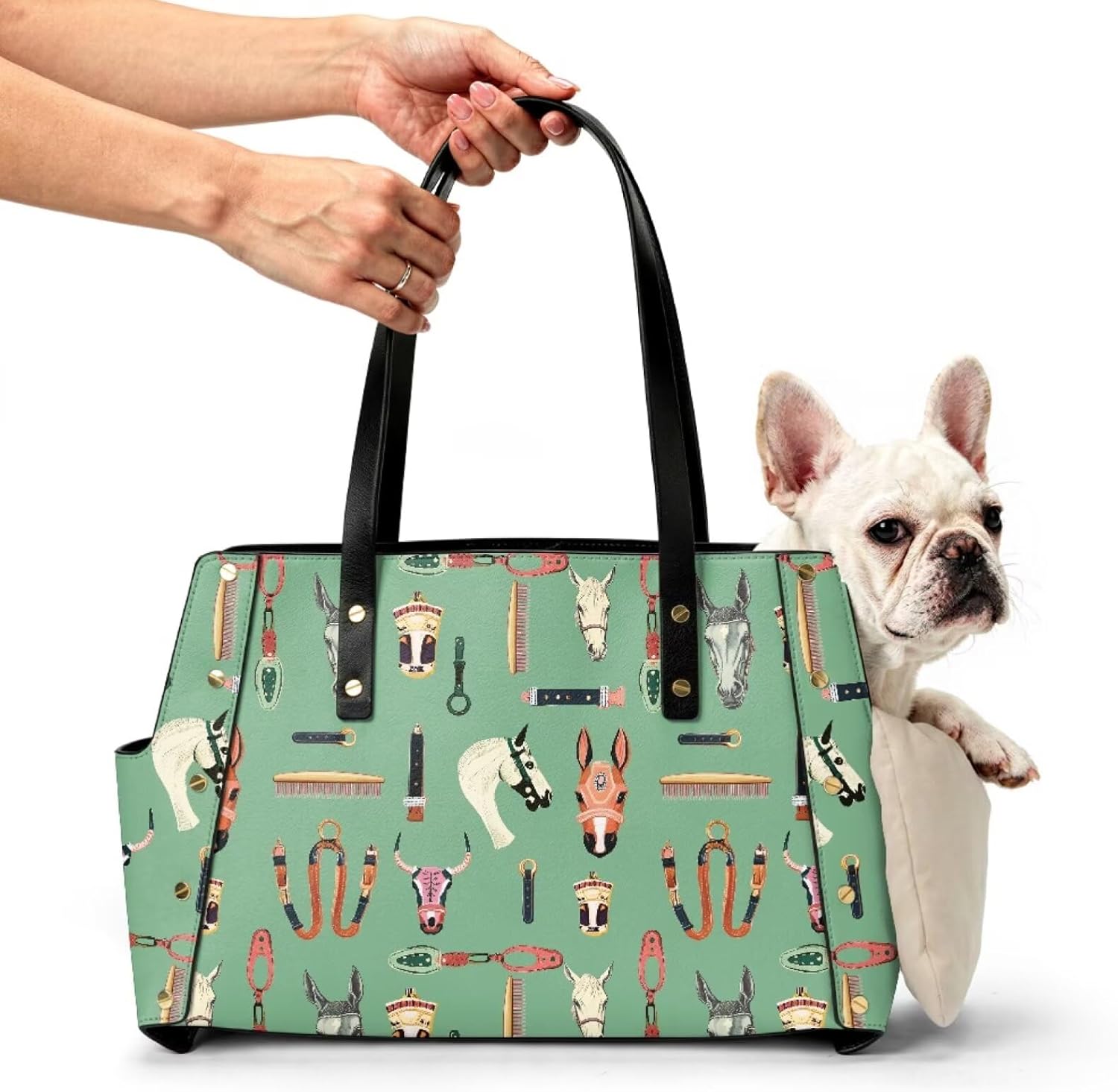 1. Product Description: This product is a soft-sided pet carriers designed for small dogs, cats, and other small animals. It features a handbag-style exterior for stylish and convenient pet transport. 2. Material: The dog purse carrier is constructed from PU leather (synthetic leather), which is designed to be waterproof, wear-resistant, and resistant to fading. The material is easy to clean with a damp cloth. Key stress points, including handle attachments and corners, are reinforced with metal rivets to increase load-bearing capacity and ensure long-lasting structural integrity during travel. 3. Dimensions: The dog travel bag measures 40 centimeters in length, 17 centimeters in width, and 24 centimeters in height. These dimensions provide ample interior space for small to medium-sized pets such as cats, small dogs, and similar animals. The open-top design of small dog purse allows pets to look out and observe their surroundings, which may help reduce travel anxiety. 4. Design Features: Removable Cushion: The pet travel bag includes a soft, plush interior cushion that provides a comfortable resting surface for pets. The cushion is removable and machine washable, allowing for regular cleaning and maintenance of a hygienic interior environment. Carrying Handles: Cat carrying bag equipped with two ergonomic black leather handles designed for comfortable hand carry. The handles are positioned to provide balanced weight distribution, reducing strain during prolonged carrying periods. Assembly: The product ships in a flat, compact package for reduced shipping volume. Assembly can be completed in a few simple steps without the need for tools, and the pet purse is ready for use within minutes. Exterior Finish: The dog carry bag maintains a sleek, structured shape due to the quality of the PU leather and construction. Multiple patterns and color options are available.