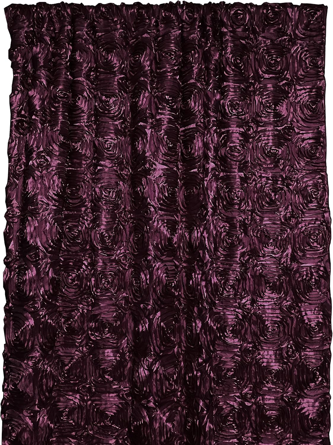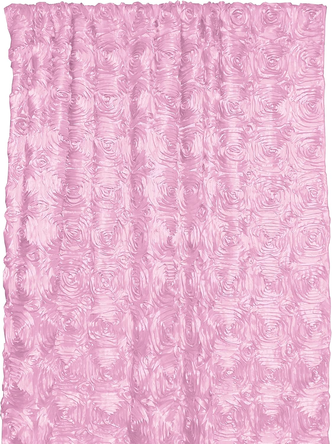 Satin rosette fabric with a textured floral look sewn into a window curtain or backdrop panel. Each panel is 54" wide and comes with a 4 inch pocket at the top for easy curtain rod/ tension rod insert. Home window, bedroom window decoration.