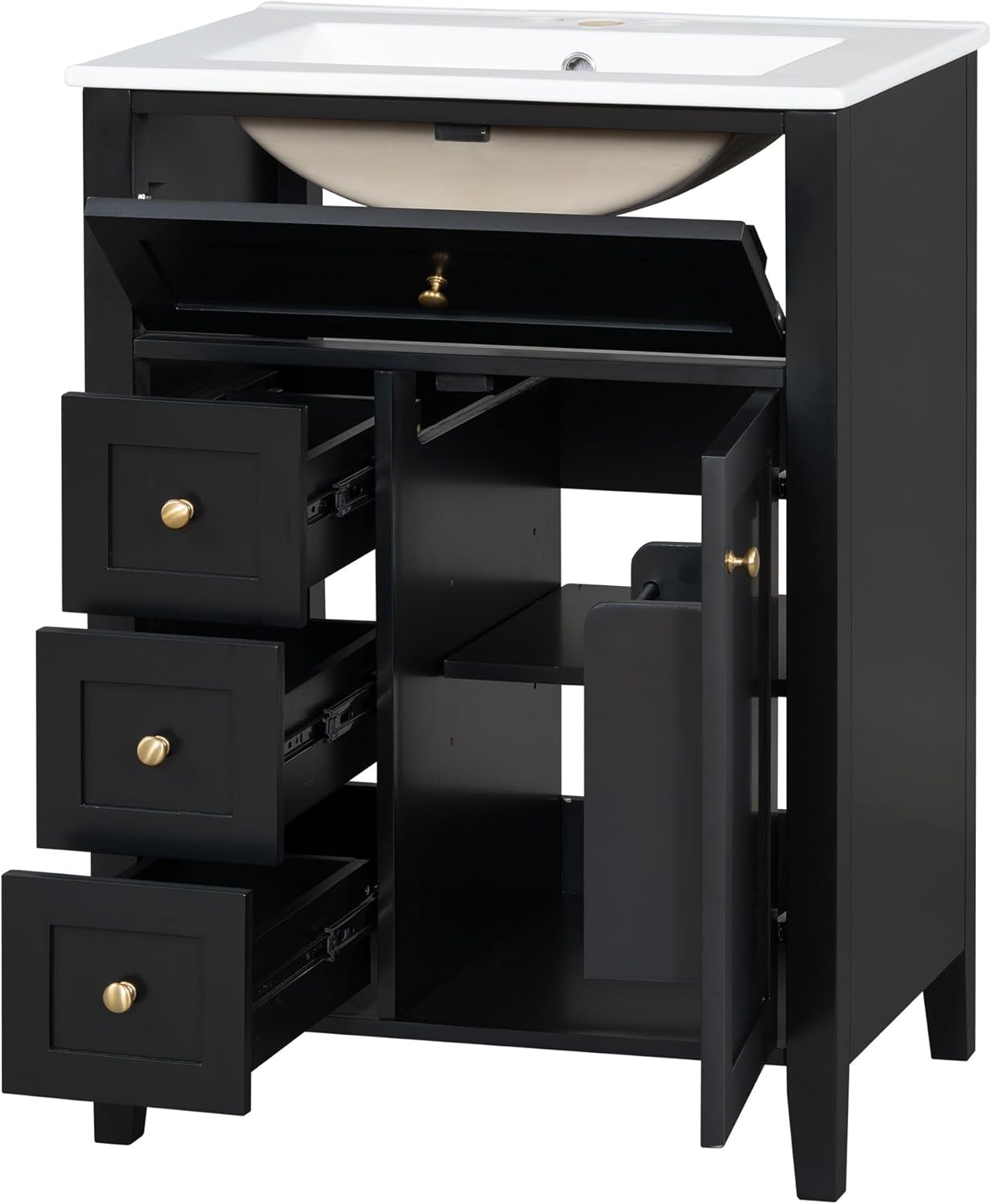 πΏ 24" White Bathroom Vanity with Sink & Storage π Space-Efficient Design β Modern vanity with ceramic sink and smart storage for compact bathrooms π¦ Core Specifications Material: MDF Board + Solid Rubber Wood + Ceramic Color: White/Black Style: Modern freestanding π Precise Dimensions Overall: 24"L x 18.3"W x 33.9"H | 84.44lb Cabinet: 23.8"L x 18.1"W x 33.2"H Sink Top: 24"L x 18.3"W x 4.7"H Edge: 0.7" thick flat edge ποΈ Storage Configuration 4 smooth-glide drawers 1 cabinet with adjustable shelves Center-mounted ceramic sink 4" centerset faucet prep Removable interior dividers π¨ Assembly & Construction Mounting: Freestanding installation Hardware: Zinc alloy knobs Capacity: 150lb total weight limit Assembly: Required (tools included) Ideal For: Bathroom, powder room, guest bath β οΈ Important Notes Faucet NOT included Β±0.15" measurement variance Weight limit strictly 150lb Color consistency not guaranteed Avoid harsh chemicals