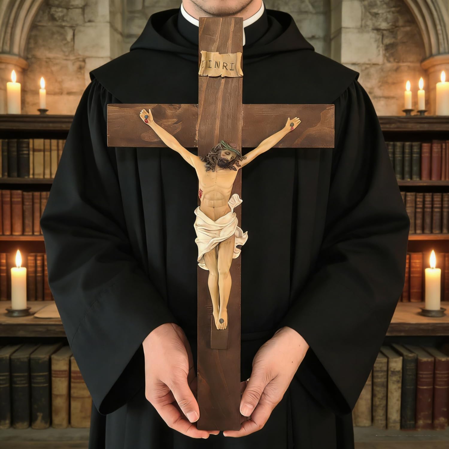 Honor your faith and bring spiritual beauty into your home with this wood crucifix wall cross, featuring a resin Jesus figure mounted on a solid wood cross. The combination of natural wood tones and the detailed sculpture of Christ creates an elegant and sacred piece for reflection, prayer, and peace. Each crucifix is carefully designed to emphasize realism and reverence. The INRI inscription above Christ’s head (“Jesus of Nazareth, King of the Jews”) adds authenticity and spiritual depth. The resin Jesus figure features lifelike textures and gentle coloring, while the wood cross carries visible grain patterns that enhance its handcrafted appearance. The crucifix measures 19.1 × 10 × 2 inches (48.5 × 25.5 × 5 cm), a perfect size for use as a Catholic crucifix for wall décor, in churches, prayer corners, or as a centerpiece for a Christian home altar. It’s fitted with a metal keyhole mount for secure hanging, making installation quick and easy. Whether used as part of Catholic wall décor, displayed above an altar, or presented as a religious gift, this wall cross symbolizes love, sacrifice, and redemption. It serves as a visual reminder of faith and devotion—an ideal addition to homes, chapels, schools, and spiritual retreat spaces. Celebrate faith through artistry and devotion with this large wooden crucifix wall cross, a cherished Christian symbol of hope and salvation.