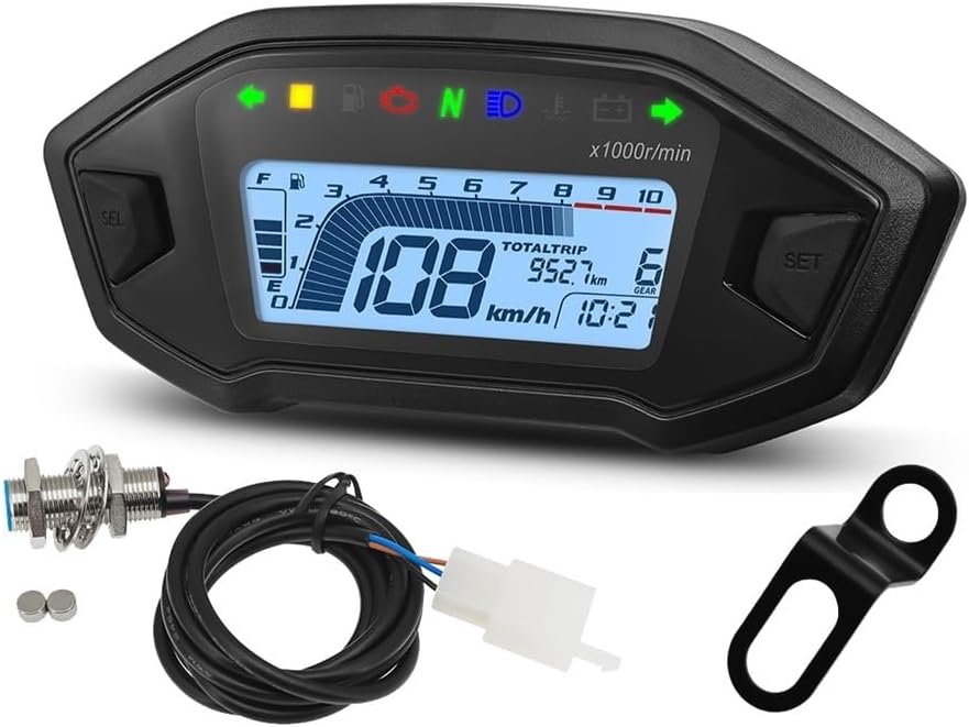 Universal For 1,2,4 Cylinder 10000RPM Motorcycle Display Tachometer Odometer Tachometer With Digital Sensor Dashboard GaugeProduct Name: Motorcycle OdometerBlack: positive yellowBlue: High beam, 12V is controlled Green/BlackBlue and white: fuel signal lineBlack and white: sensor signalOperating voltage: 10V-15VSpeed calibration: 42.5Hz corresponds to 60KM/HGreen: negative sensorSpeed calibration: 166Hz corresponds to 13*1000r/minVoltage: Less than 11.3V undervoltage symbol flashes, higher than 11.7V undervoltage symbol is not displayedFuel calibration: E point 98, F point 8Orange: Left turn, 12V positive control yellow/whiteLight blue: Turn right, 12V is controlled Green/RedMaterial Type : Plastic+GlassyHope you can buy your favourite products in the shop, welcome to the next visit.