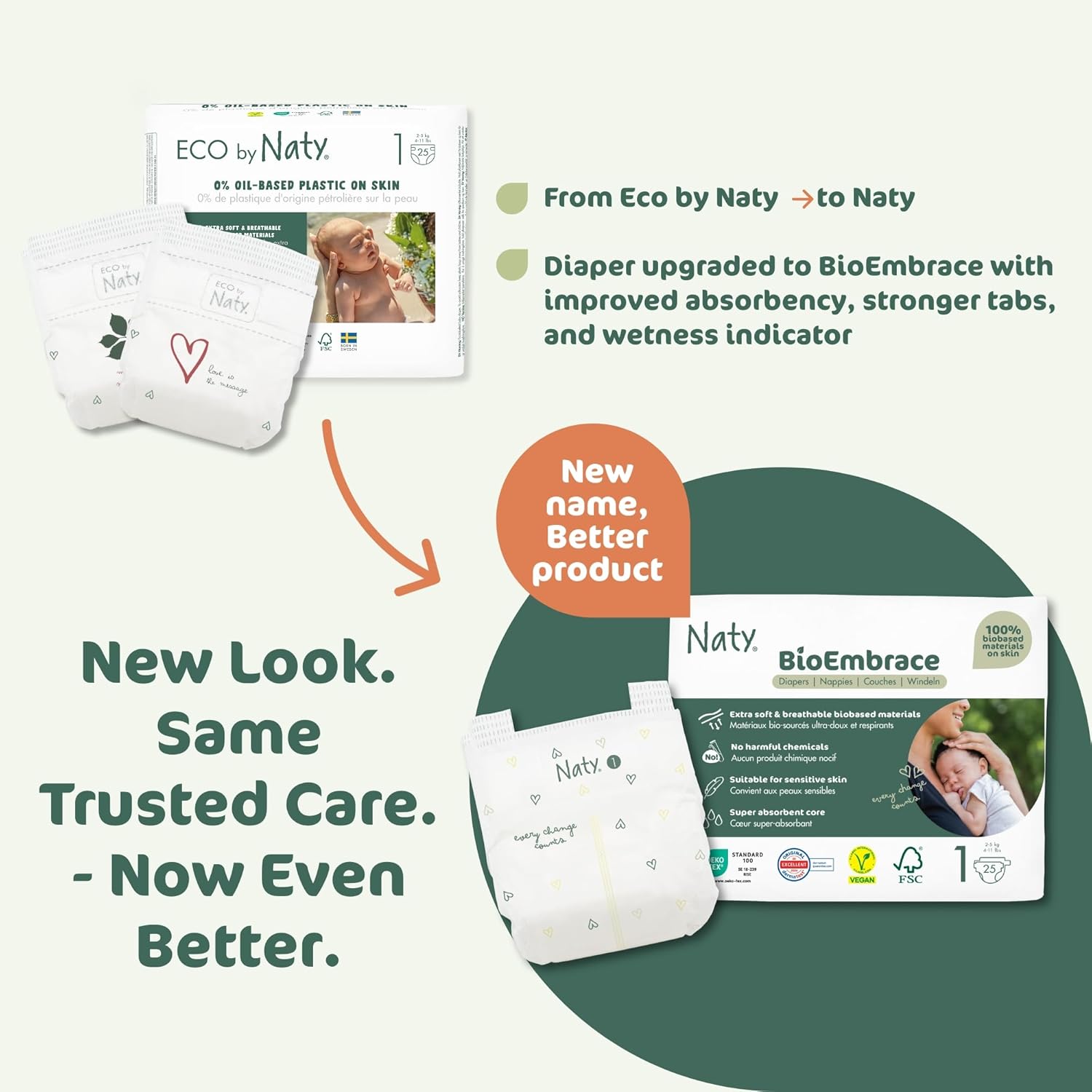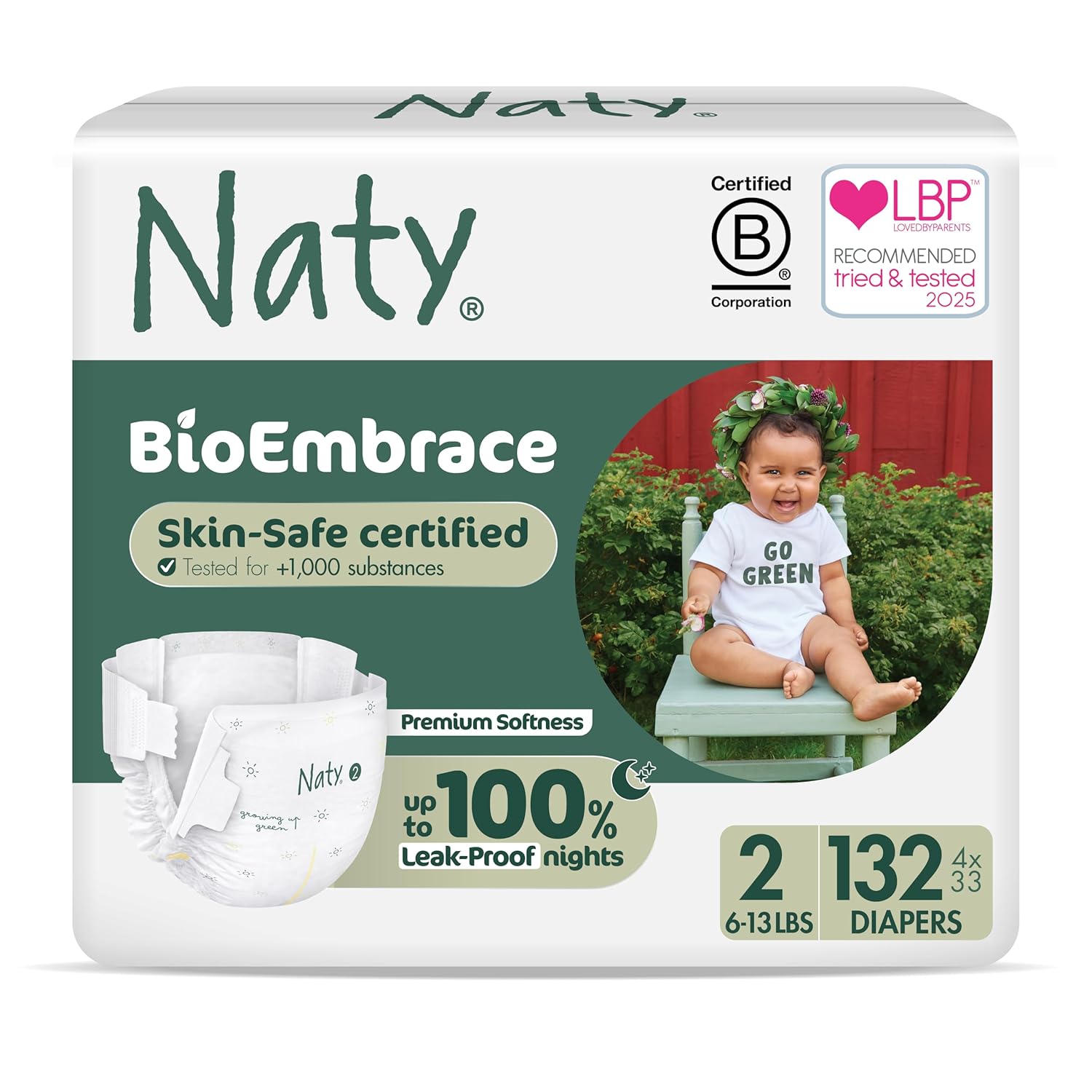 Naty BioEmbrace diapers are skin-friendly, plant-based premium disposable baby diapers for sensitive skin and reliable day & night dryness. They’re the only diapers with 100% plant-based materials on skin (liner, cuffs, ears and outer layer), certified skin-safe, with teddy-soft, breathable comfort and up to 100% leak-proof protection.* Dermatologically tested “Excellent” on sensitive skin (Dermatest) and OEKO-TEX® Standard 100 certified, verified against 1,000+ substances such as chlorine, PFAS, parabens, phthalates and dyes. Fragrance-free, without lotion or latex, and vegan. Super absorbent for day & night dryness with up to 12h protection. 9/10 parents rated dryness on skin “Excellent”.* Multi-dry layer protection with FSC-certified pulp and a wetness indicator on all sizes. Teddy-soft, stretchy fit designed to stay comfy as baby moves, with gentle leg cuffs to help keep leaks in. Cute Scandinavian forest prints. Available in sizes 1–6 (Size 1 includes an umbilical cord cut-out). Developed in Sweden since 1994. Certified B Corporation™. Previously Eco by Naty—now Naty. *Based on consumer test (Size 4).
