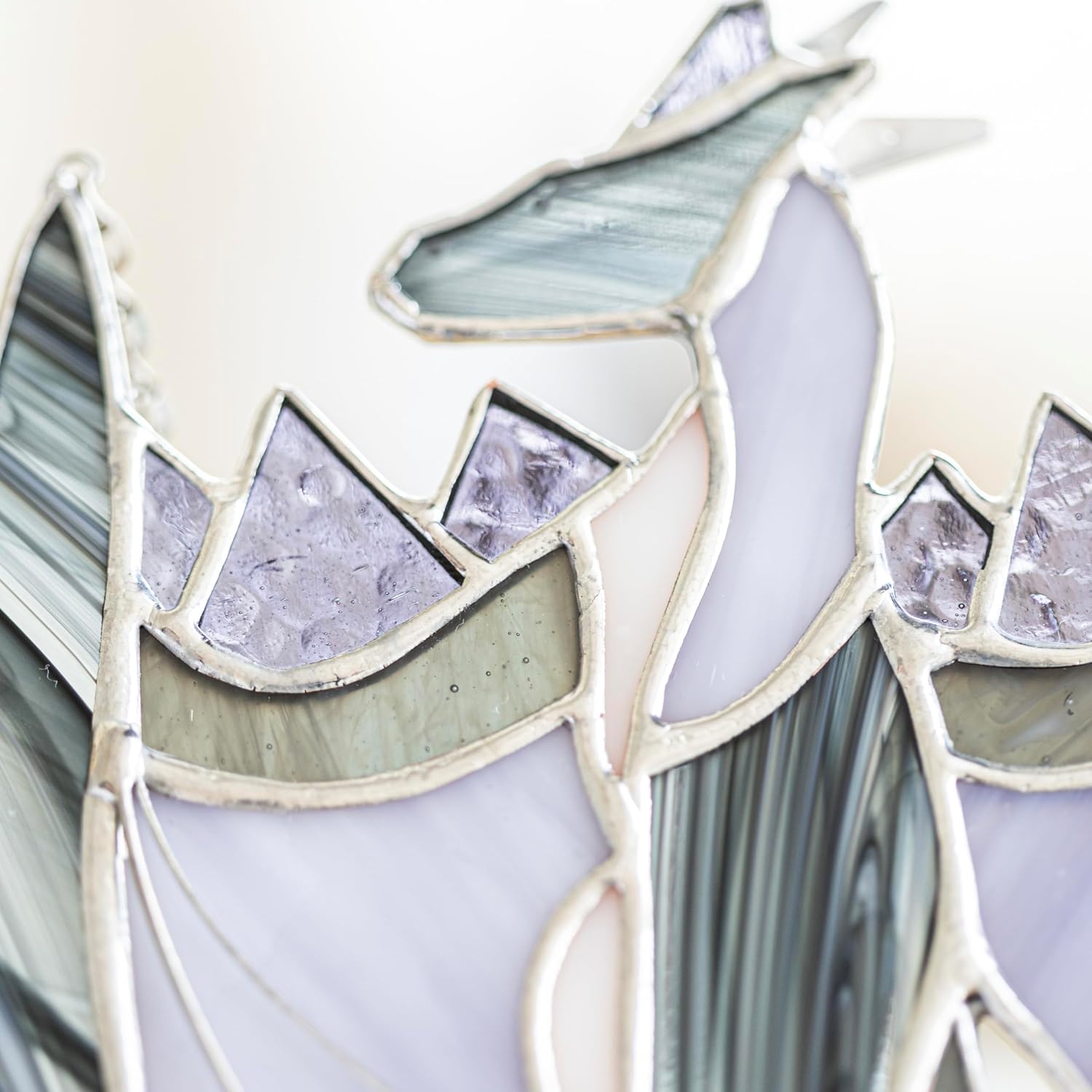Dragon Stained Glass Window Suncatcher, Crafted with Unique Design and Tiffany Copper Foil Technique. Handmade to Showcase the Beauty of Purple and Grey Tones. Mesmerizing in Sunlight, a Stunning Addition to Any Space.