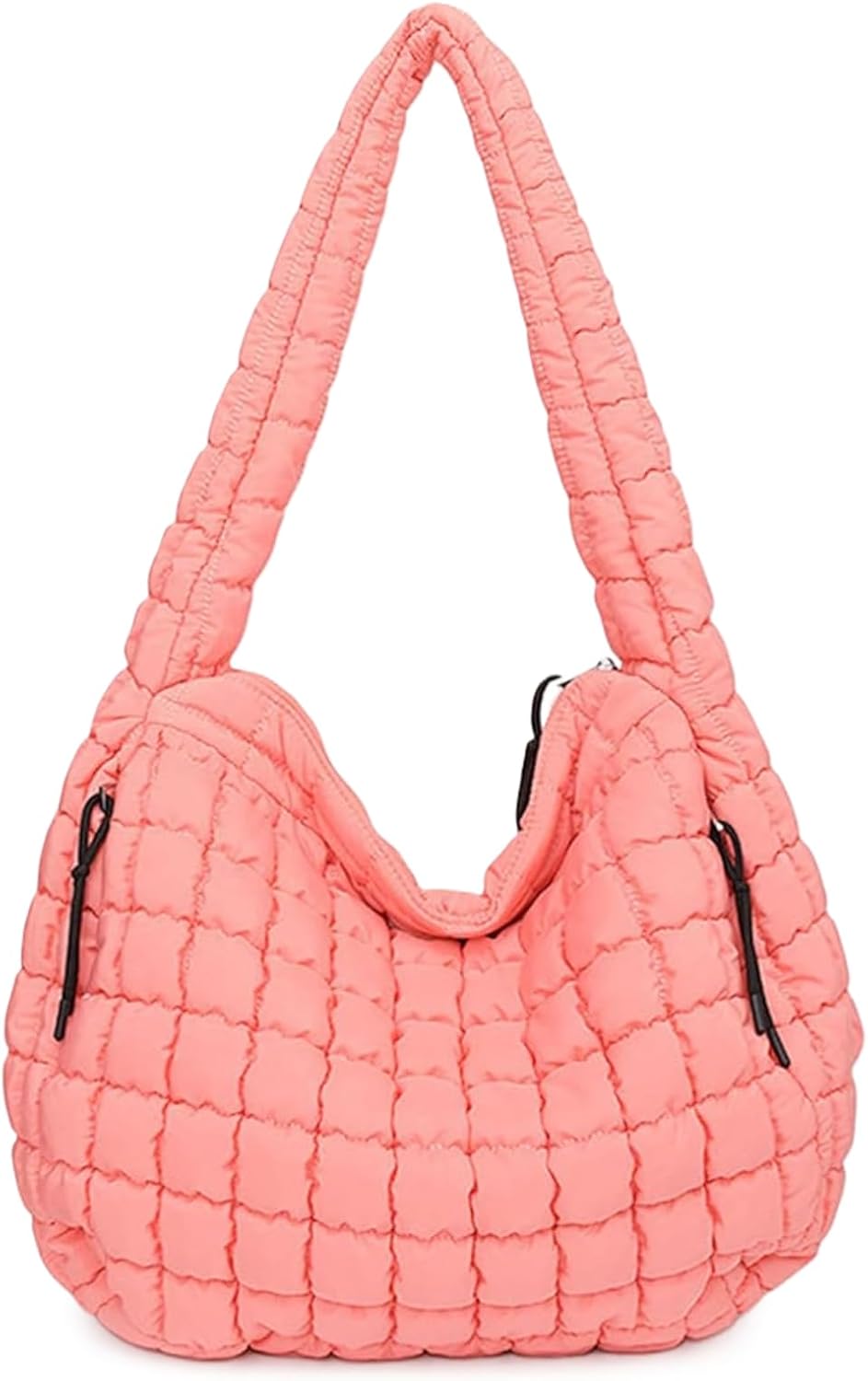 Elevate your everyday style with this trendy quilted puffer tote bag. The spacious hobo silhouette features luxurious quilted nylon construction with synthetic padding that creates a soft, cloud-like texture. Perfect for daily use or travel, this oversized carryall offers ample storage with its roomy main compartment and convenient front zip pocket. The versatile design includes both double top handles and a detachable shoulder strap for multiple carrying options. Measuring 18 inches in length and 11 inches in height, this contemporary bag provides plenty of space while maintaining a lightweight feel. The durable nylon lining and secure zipper closure keep your belongings protected, while the modern quilted pattern and contrast stripe trim add sophisticated detail. Available in multiple colors, this fashion-forward tote seamlessly combines functionality with style, making it an ideal choice for the fashion-conscious woman on the go. The bag's thoughtful design includes two handles and can hold up to 25 cubic centimeters of your essential items.