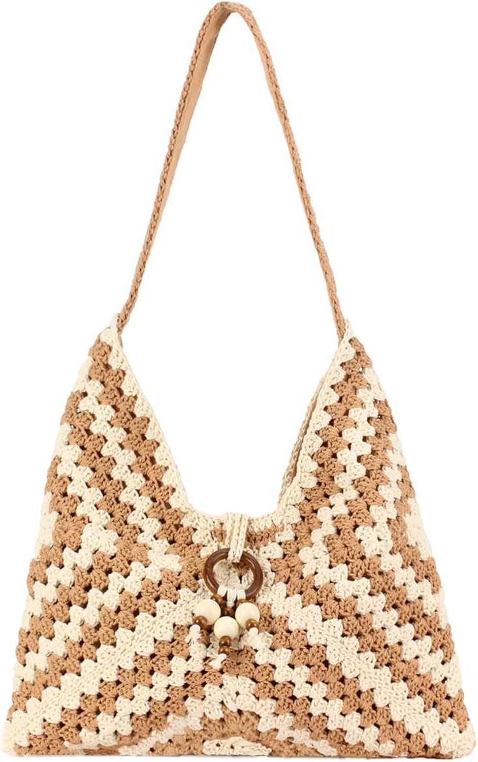 Add a touch of bohemian charm to your summer wardrobe with this beautifully handcrafted hobo bag. The intricate crochet pattern features a stunning array of colors including vibrant coral, navy blue, turquoise, and neutral tones, creating an eye-catching geometric design. This spacious tote bag combines style with functionality, perfect for beach outings, vacation trips, or everyday use. The relaxed hobo silhouette and woven yarn construction offer a casual yet sophisticated look, while the decorative wooden beads add a distinctive ethnic flair.The shoulder strap provides comfortable carrying, and the roomy interior ensures ample space for your essentials. Each bag showcases unique artisanal craftsmanship, making it an ideal accessory for those who appreciate distinctive, bohemian-inspired fashion. The versatile design complements both casual summer dresses and everyday wear, making it a practical and stylish addition to your accessory collection.