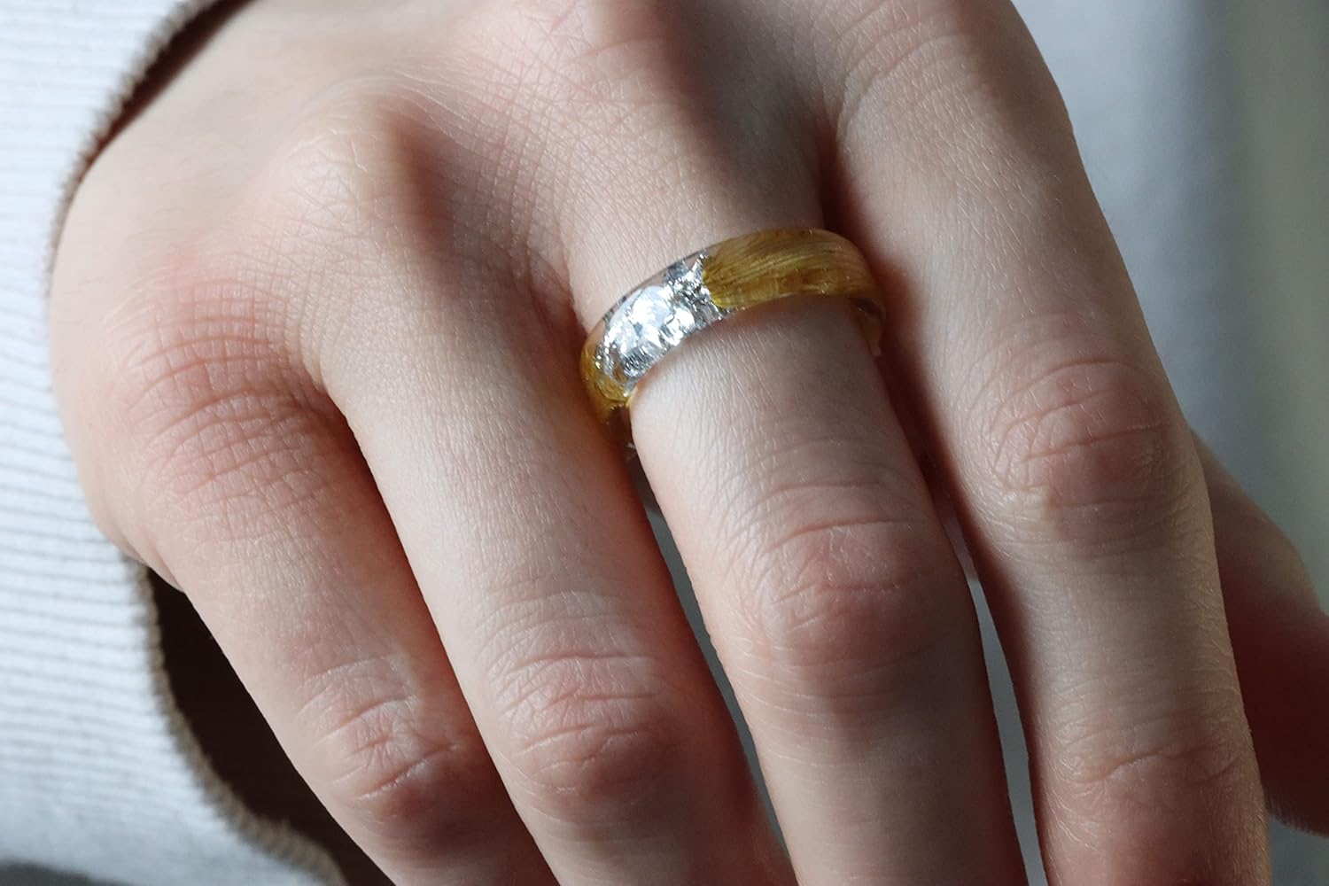 Resin ring with pressed yellow sunflower petals. Material: resin, sunflower petals, gold/copper/silver flakes. Width: 5 mm.