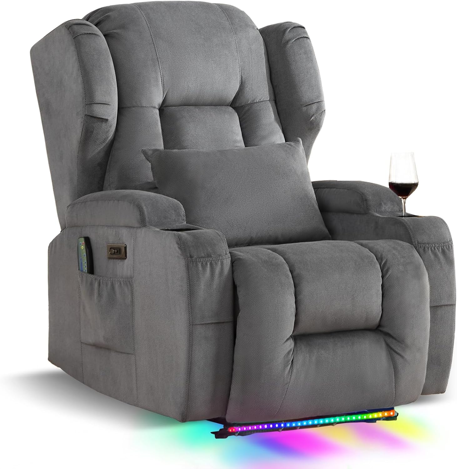 | Recommended Uses For Product | Activate the massage and heat functions to relieve stress and relax your back and lumbar after a long day., Create a perfect movie theater setup by combining this recliner with a TV and surround sound for a cinema-like experience at home., Place drinks in the cup holders to enjoy your favorite beverages without having to leave the chair, making movie nights even more enjoyable., Position the chair in your living room for a stylish and modern seating solution that adds both comfort and elegance to your space., Store your remote and phone in the side pockets to keep them handy and prevent clutter in your living space., Take advantage of the USB Type-C port for fast charging of your phone, keeping your devices powered up while you relax., Use the LED light strip to create a cozy atmosphere, perfect for movie nights or evening relaxation., Use the chair in your RV to create a comfortable and cozy seating area for long trips or camping., Use the electric reclining function to easily adjust your seating position and find the perfect angle for comfort., Use the oversized design for extra-wide comfort, accommodating people of all sizes for maximum relaxation., Use the wall hugger design to place the chair closer to the wall in tight spaces, ideal for small apartments or compact rooms. |
