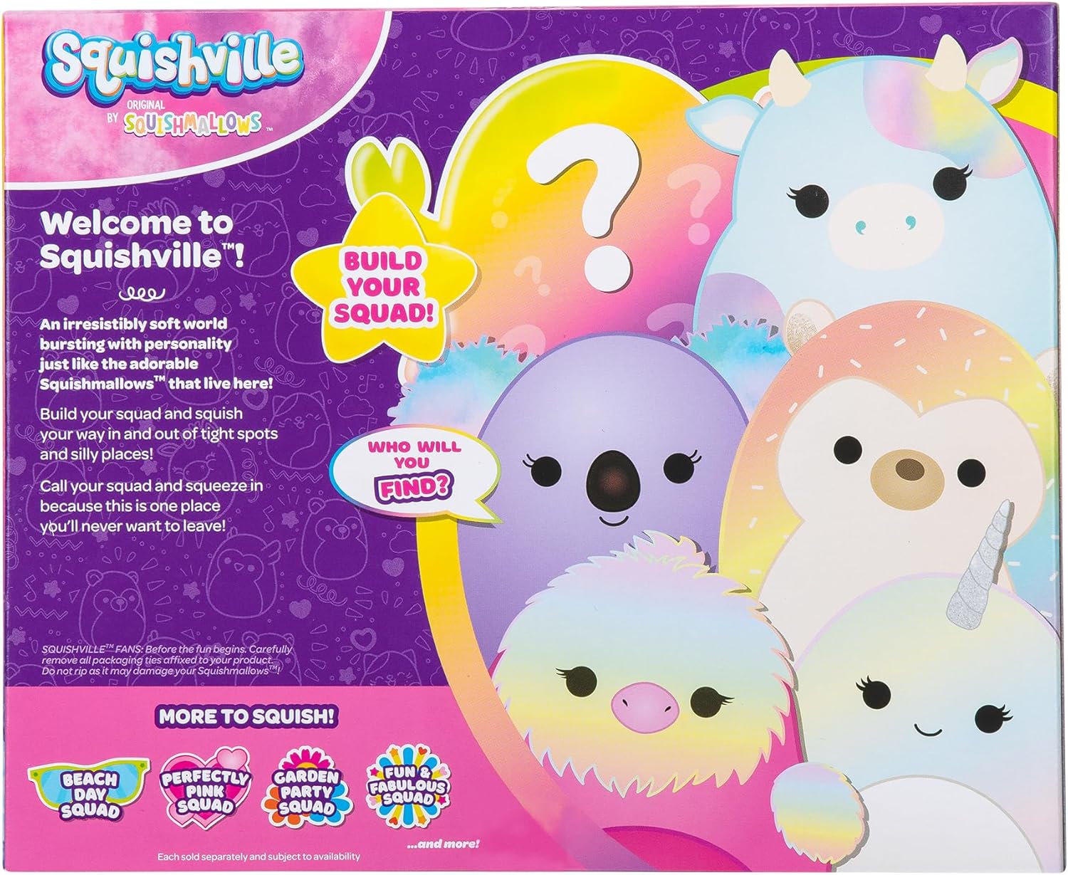 Get ready to play in style with the radiant, Fun & Fabulous Squad! This colorful Squad 6-pack comes with some of your favorite Squishmallows in an exclusive 2-inch size, Renate the lavender Koala, Bowie the rainbow tie-dye Hedgehog, Caedia the Blue Cow, Marianovella the rainbow Narwhal, Abilene the hot pink Ostrich, and a surprise Squishmallow! All are made with super soft filling and bursting with personality. Build out the world of Squishville with 2-inch Squishmallows, playsets, 6-packs, and more!