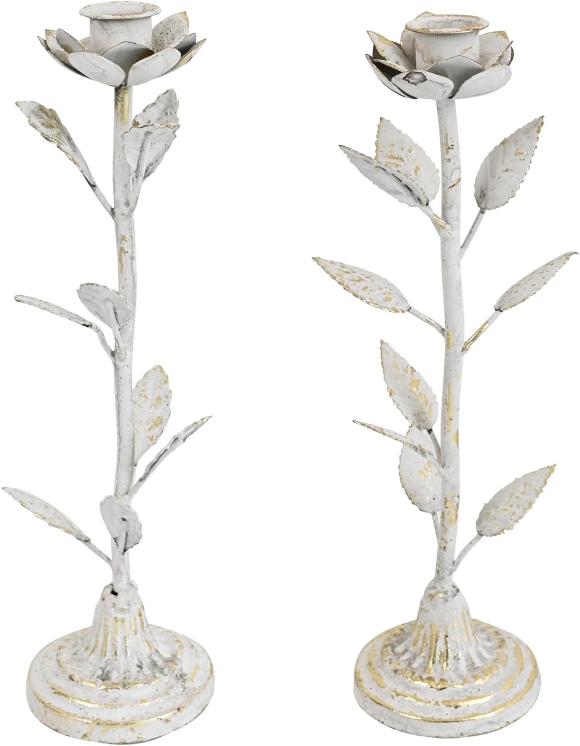 Bring whimsical, vintage garden charm to your home with this set of 2 floral candle holders! Each stand features a distressed white/gold metal body, delicate leaf details, and a flower-shaped candle cup — mimicking a blooming flower for a romantic, cottagecore aesthetic. The set includes 2 graduated sizes (11.42" tall & 8.86" tall) with 4.72" wide stable bases, making them ideal for creating layered displays on dining tables, mantels, or side shelves. Crafted from lightweight yet sturdy metal (total 0.77 lbs), they’re easy to move while staying balanced (fits standard 0.86" diameter taper candles, not included). Whether you’re styling a cozy dinner party, adding rustic flair to your living room, or decorating for a wedding, these candle holders blend nostalgic charm with practicality. Their weathered finish and floral design make them a versatile accent for farmhouse, shabby-chic, or boho-themed spaces — instantly softening any room with warm, romantic light.