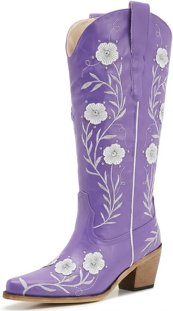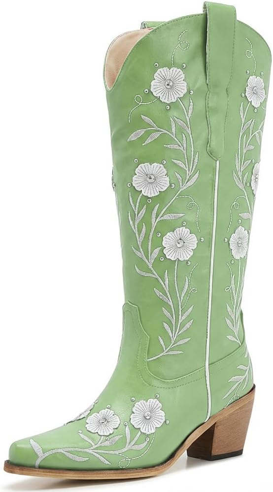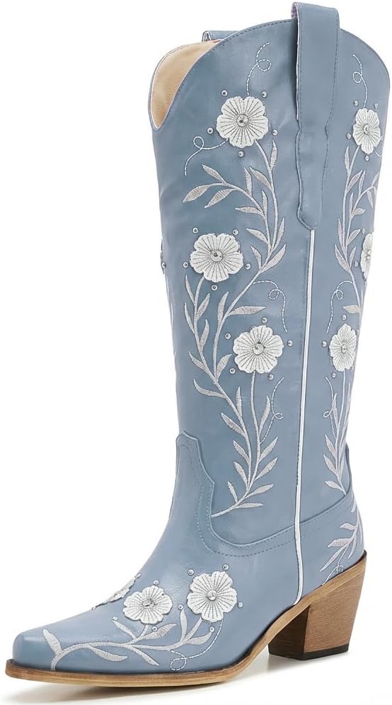 Step into confident western style with these Women’s Wide Calf Turquoise Embroidered Cowgirl Boots, designed to embrace every curve beautifully. The extended calf width ensures a comfortable, non-restrictive fit for women who need extra room around the legs — offering both function and flair. The turquoise faux leather base is decorated with delicate floral embroidery, creating a bold, feminine, and distinctly western statement. Inside, a soft lining and cushioned insole deliver all-day comfort, while the low block heel provides stable support for walking, dancing, or riding. Whether for a country concert, western wedding, or everyday wear, these boots combine plus-size inclusivity with classic cowgirl charm — because every woman deserves a perfect fit with